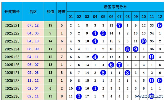 上期后区开出奖号02、11,奇偶比1:1,近10期奇偶比8:12,偶数奖号开出较热,本期推选奇偶比2:0,参考后区号码01、09。